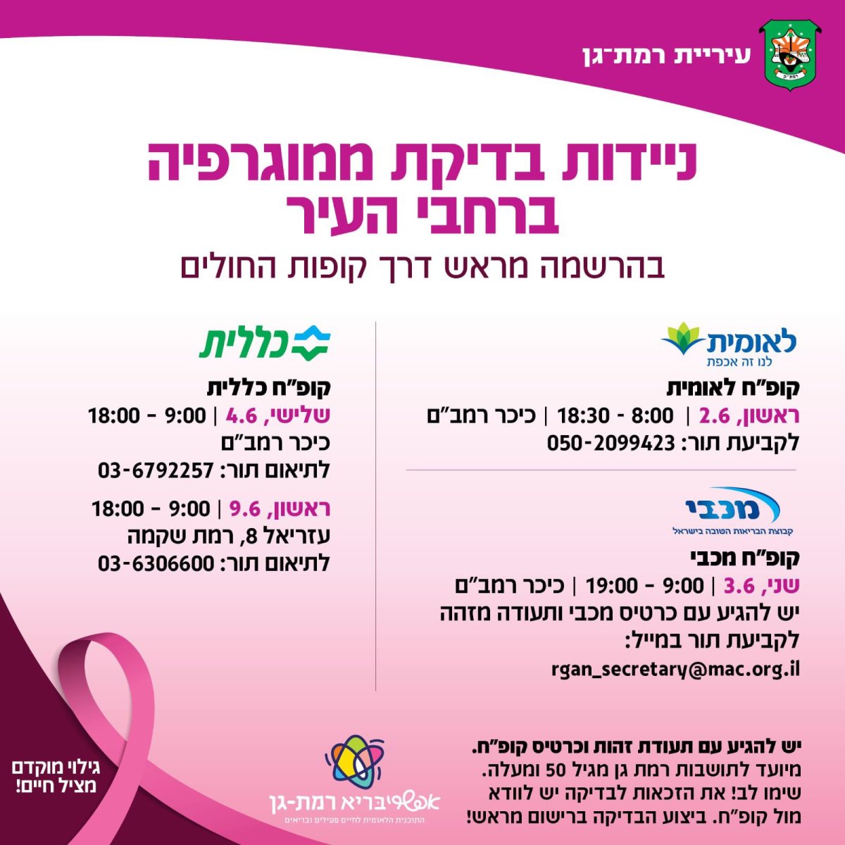ניידות הממוגרפיה הוצבו בכיכר רמב״ם ובשכונת רמת שקמה וניתן להגיע ולהיבדק ללא עלות בהרשמה מראש באתרי קופות החולים. ראש העיר רמת-גן, כרמל שאמה הכהן: אני קורא לכל תושבות העיר- בואו להיבדק! אנו פועלים להנגיש עבורכן את ניידות הממוגרפיה, ללא עלות ובמינימום מאמץ. בהליך פשוט וקרוב לבית ניתן להיבדק, ונזכיר- גילוי מוקדם מציל חיים. שנדע רק בשורות טובות״.